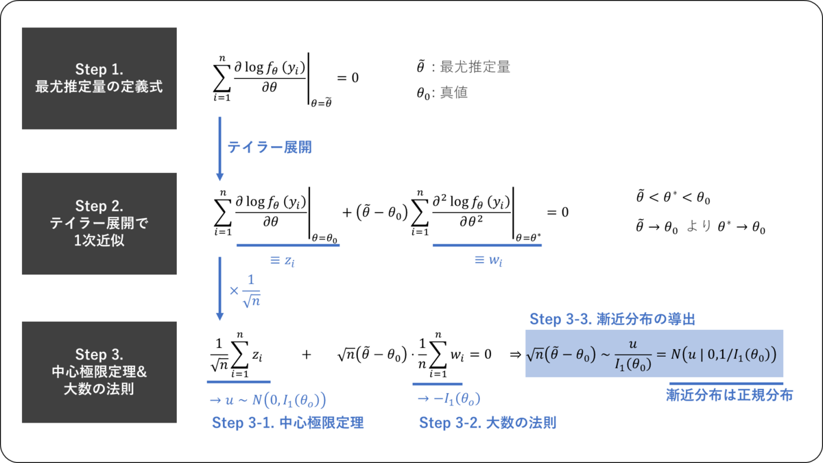 漸近正規性の導出は,尤度方程式のテイラー展開を起点に,中心極限定理と大数の法則を組み合わせて,最尤推定量の極限分布を得る流れとなっている。この過程をステップごとに追うことで,最尤推定量がなぜ「漸近的に正規分布に従うのか」が論理的に理解できる。そしてその分散がフィッシャー情報量の逆数となり,クラメール・ラオの下限を達成することで「漸近有効性」が保証される。